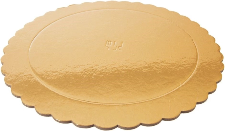 Elegante gouden taartonderlegger met een diameter van 26 cm, ideaal voor presentatie, verplaatsen en veilig transport van desserts. Hij is dubbelzijdig, gemaakt van stevig karton met aan beide zijden een beschermfolie en heeft een decoratieve gegolfde rand. Dankzij het waterbestendige oppervlak is hij geschikt om de taart in de koelkast te bewaren en draagt hij zonder problemen ook zwaardere taarten.