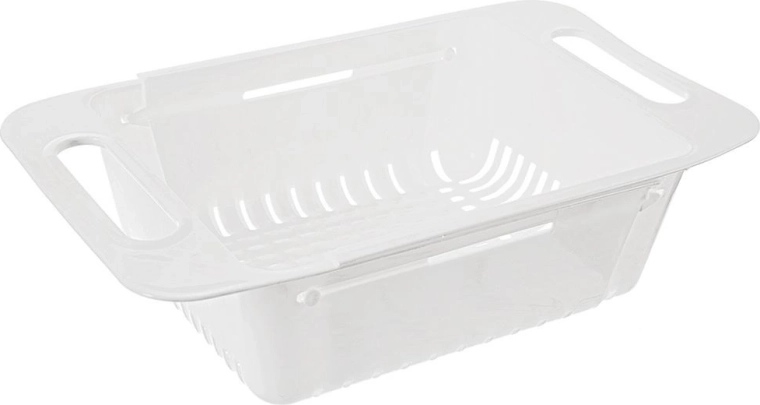 Universele gootsteenzeef met verstelbare lengte voor het gemakkelijk wassen van fruit en groenten en het afgieten van pasta. Gemaakt van duurzame kunststof in het wit, eenvoudig te reinigen en vaatwasmachinebestendig. Dankzij de telescopische handgrepen past hij op spoelbakken van verschillende afmetingen.