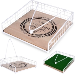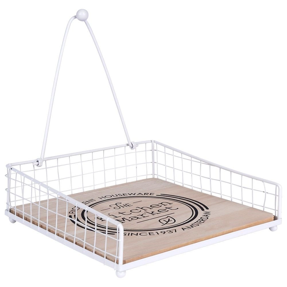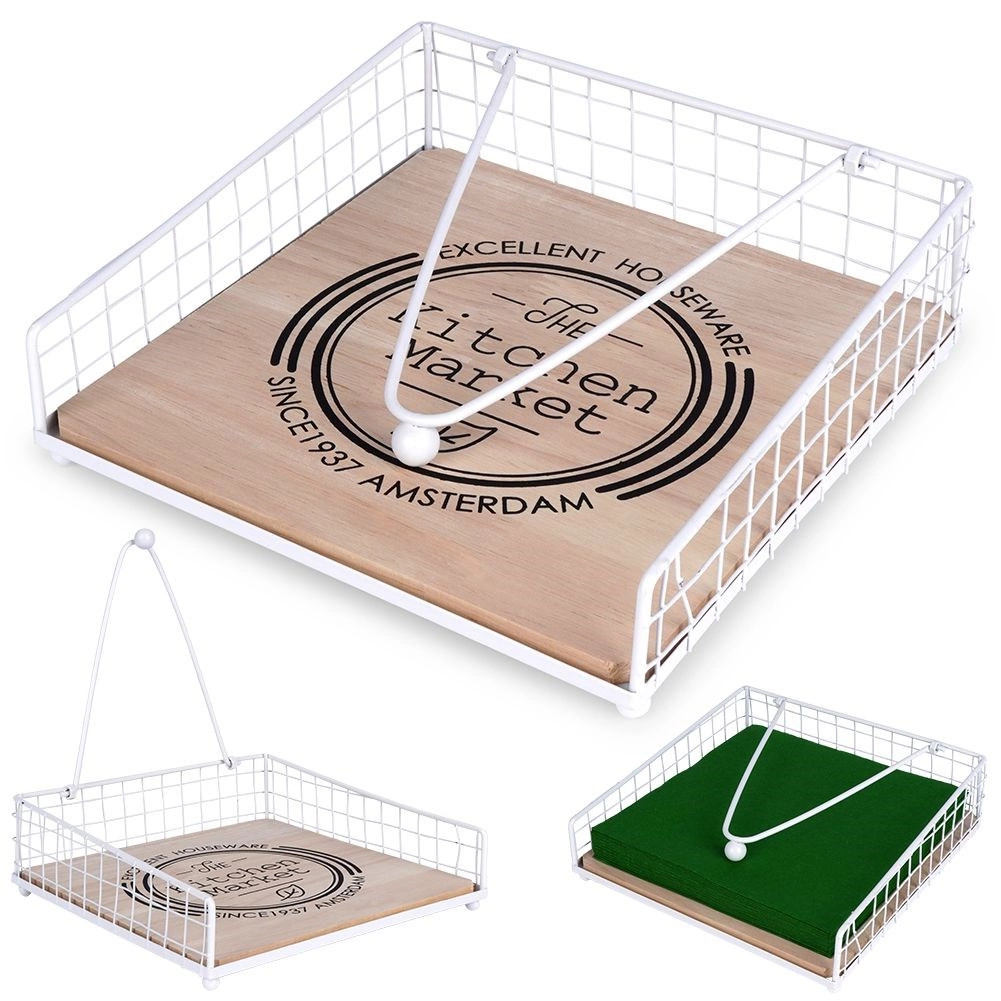 Een elegante en praktische servettenhouder met aandrukarm houdt servetten thuis en buiten stevig op hun plaats. De combinatie van wit metaal en eikenhout met de opdruk “The Kitchen Market” geeft je keuken stijl. Stabiele aandrukarm, duurzame materialen en universeel gebruik op tafel, in de tuin of op het terras.