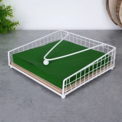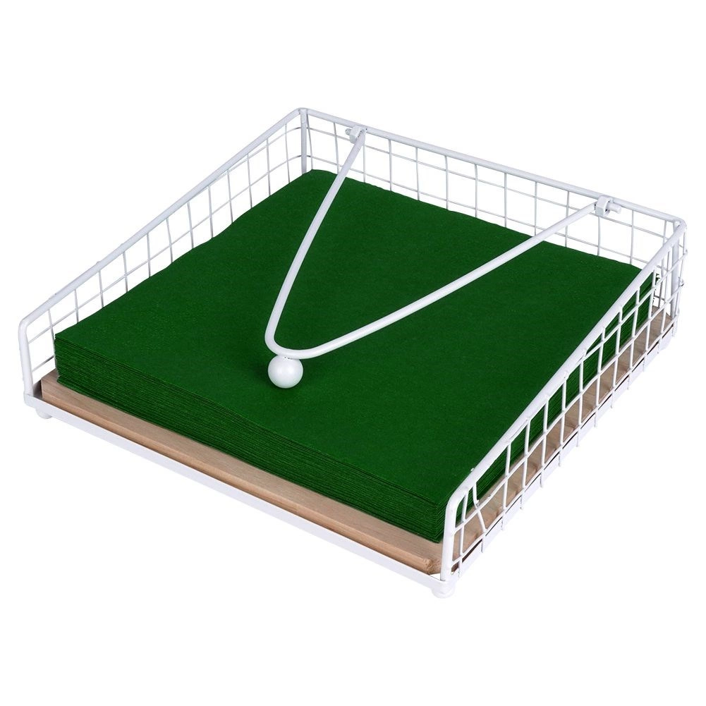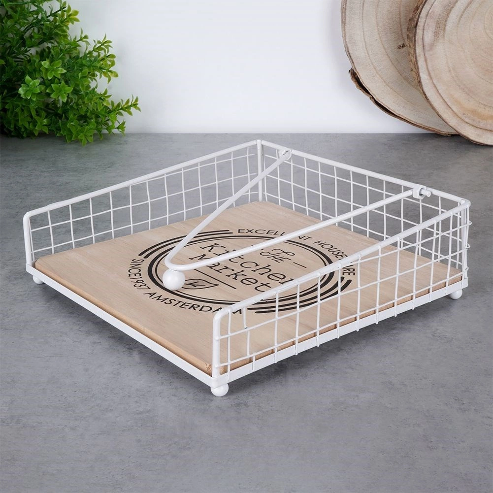Deze witte metalen servettenhouder met houten detail is ontworpen voor comfortabel doseren van servetten en perfecte fixatie dankzij de aandrukarm. Geschikt voor de keuken, eetkamer en voor buiten dineren – in de tuin, op het terras of balkon.