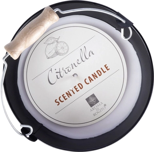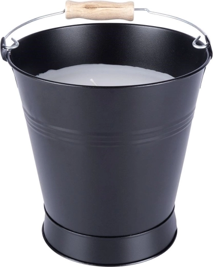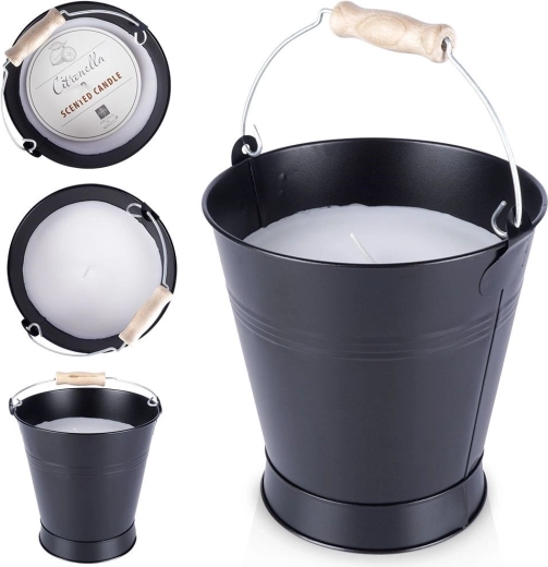 Een stijlvolle geurkaars in een metalen emmer met handvat brengt in huis en op het terras een intense citroengeur en een lange brandduur. Het stevige ontwerp van metaal in het zwart, de hout-metalen greep en het effectvolle reliëf maken van deze kaars ook een prachtige decoratie. Geschikt voor binnen en buiten, creëert een prettige, frisse en ontspannen sfeer en kan helpen insecten te weren.