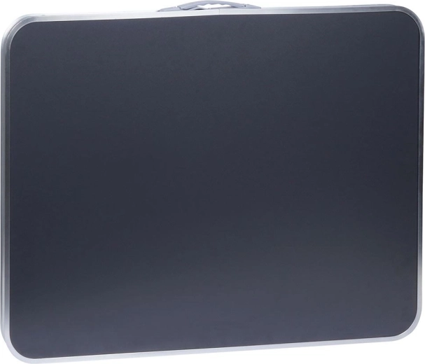 Het MDF-blad is voorzien van een slijtvaste toplaag die beter bestand is tegen vocht en dagelijks gebruik. De stabiele metalen constructie met aluminium rand houdt de vorm en geeft de tafel extra stevigheid. Ingeklapt heeft hij compacte afmetingen van 80 × 61,5 × 6 cm, onder het blad is ruimte om de poten op te bergen en dankzij de geïntegreerde handgreep neemt u hem makkelijk mee.