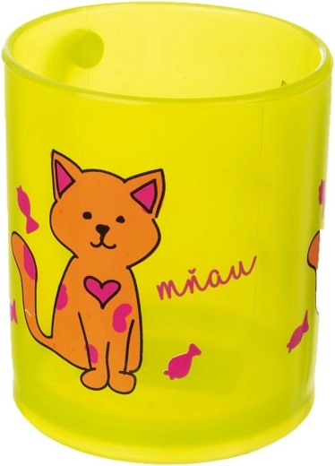 Lichte en duurzame kinderbeker met oor, inhoud 260 ml, in halftransparant geel met een kattenversiering. Ideaal voor thee, water, sap en cacao. Geschikt voor vaatwasser en magnetron, BPA-vrij, voor kinderen vanaf 3 jaar. Duurzaam materiaal, comfortabel oor en veilig in gebruik elke dag.