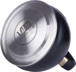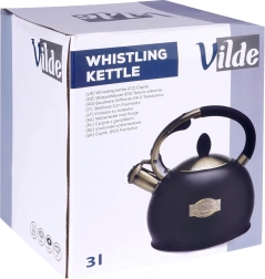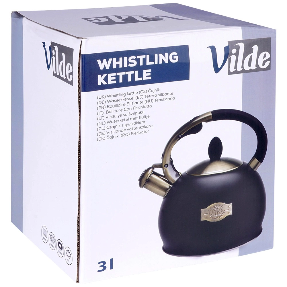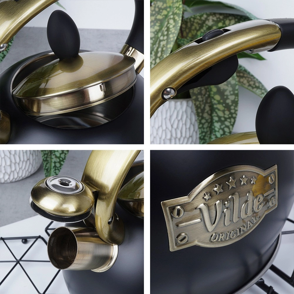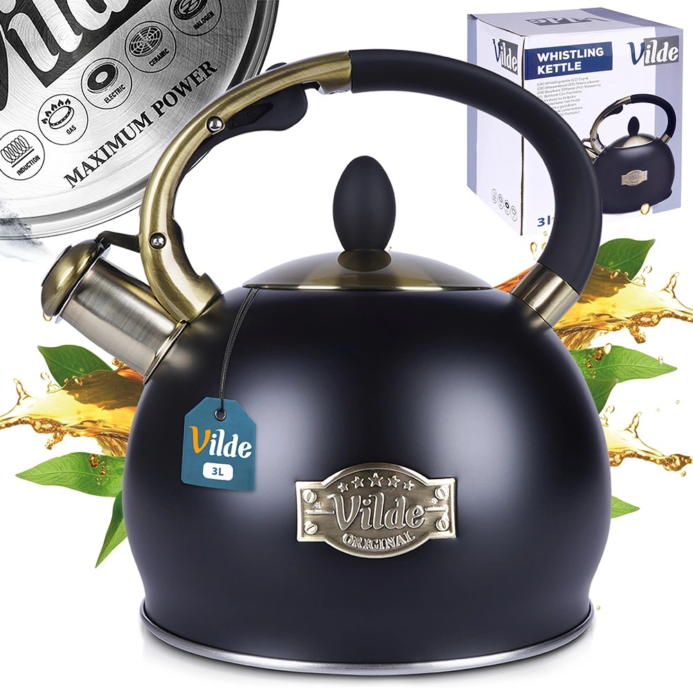 Mat zwart in combinatie met messingdetails en het Vilde-embleem geeft de ketel een tijdloze uitstraling die perfect past in zowel moderne als klassieke keukens.