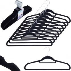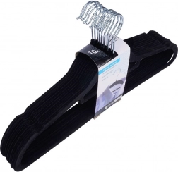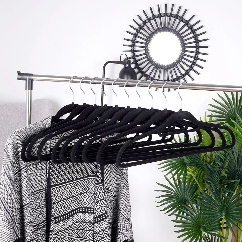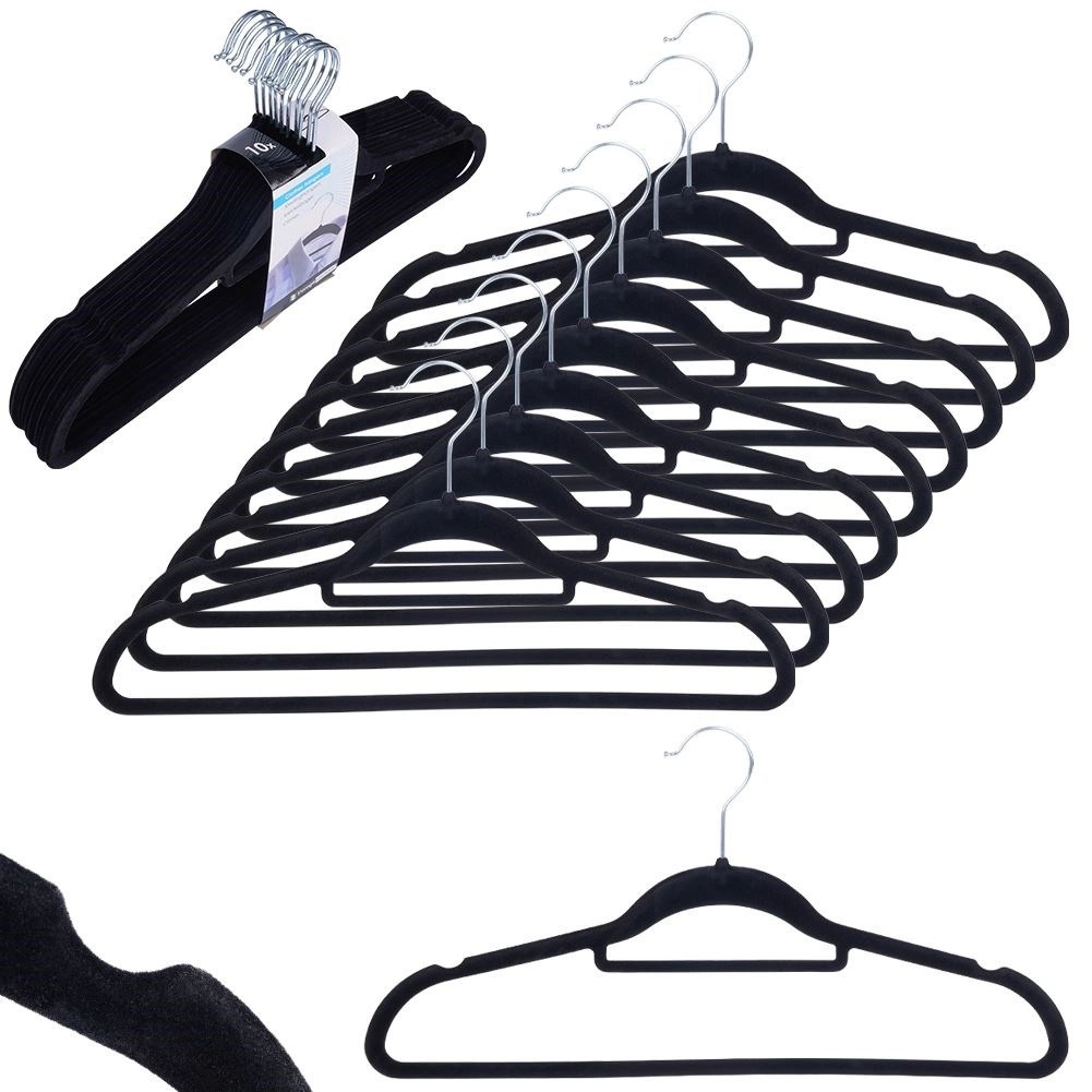 Praktische set van 10 slanke hangers met een zacht fluwelen oppervlak helpt je kast overzichtelijk te houden en bespaart ruimte. De antislip afwerking houdt kleding veilig op zijn plaats, terwijl de draaibare metalen haak het ophangen in elke richting vergemakkelijkt.