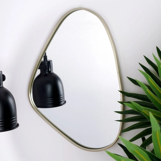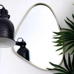 Breng je interieur tot leven met een spiegel die functionaliteit en moderne elegantie combineert. De onregelmatige vorm komt tot zijn recht in zowel klassieke als hedendaagse ruimtes, terwijl de champagnegouden kleur van het frame de kamer een verfijnde uitstraling geeft. De spiegel is ideaal als praktische hulp voor dagelijks gebruik én als decoratief element dat de ruimte optisch vergroot en oplicht.