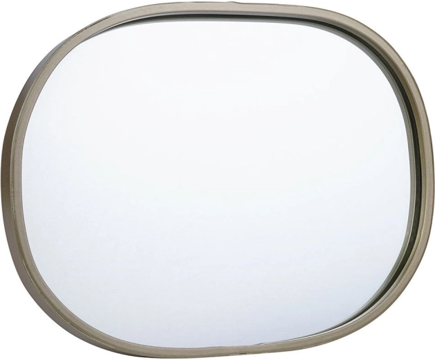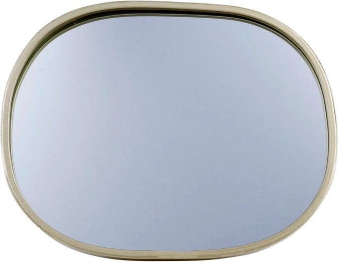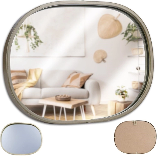 Stijlvolle wandspiegel met een ovale silhouette in elegant champagnegoud; een tijdloze toevoeging aan woonkamer, hal en slaapkamer. De metalen lijst benadrukt het design en beschermt het spiegeloppervlak voor dagelijks gebruik.