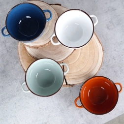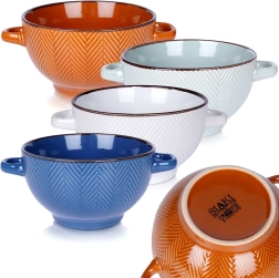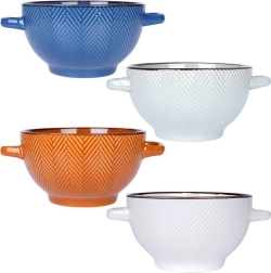 De kommen in harmonieuze kleuren (wit, blauw, oranje/lichtbruin en grijs) hebben een stijlvolle visgraat/chevronreliëf en een contrasterende rand, waardoor ze op elke tafel prachtig uitkomen. Ze zijn perfect niet alleen voor soepen en crèmes, maar ook voor ontbijtgranen, yoghurt, fruit, salades en hartige of zoete snacks.