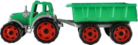 De tractor valt op door zijn levendige kleuren en duurzame plastic constructie, die zorgt voor duurzaamheid en veiligheid tijdens het spelen.