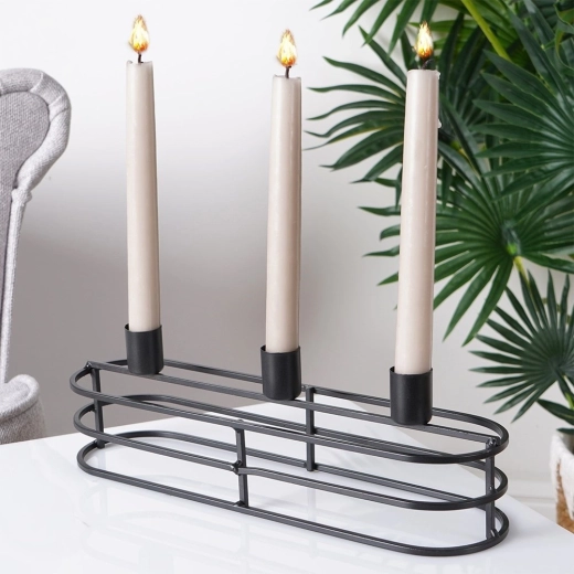 Drie cilindrische houders houden de kaarsen veilig op één lijn. Ideaal voor kaarsen tot 2 cm diameter en voor sfeervolle tafelarrangementen.