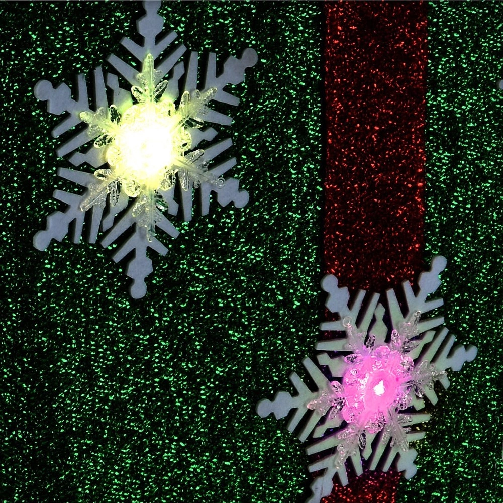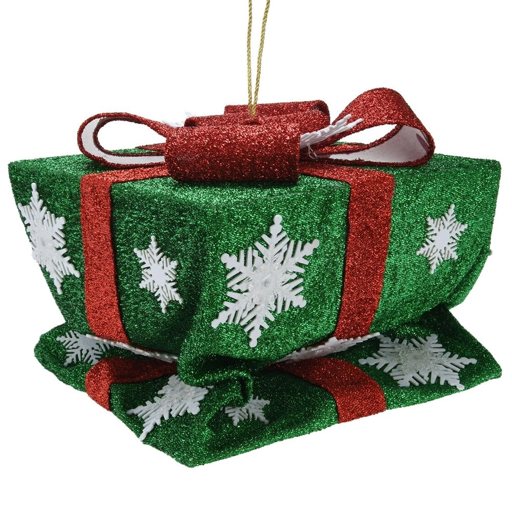 De glinsterende groene afwerking met sneeuwvlokken en de rode strik vormen een opvallend accent in huis en tuin.