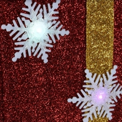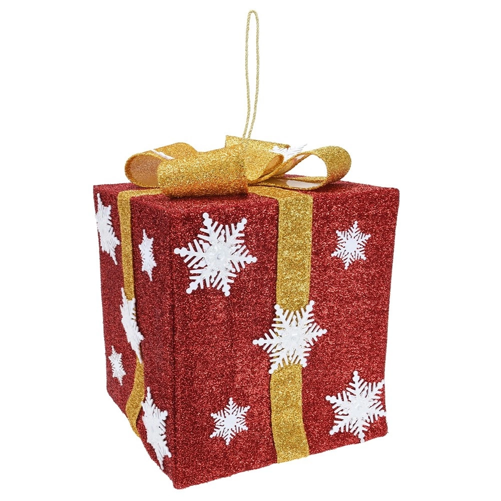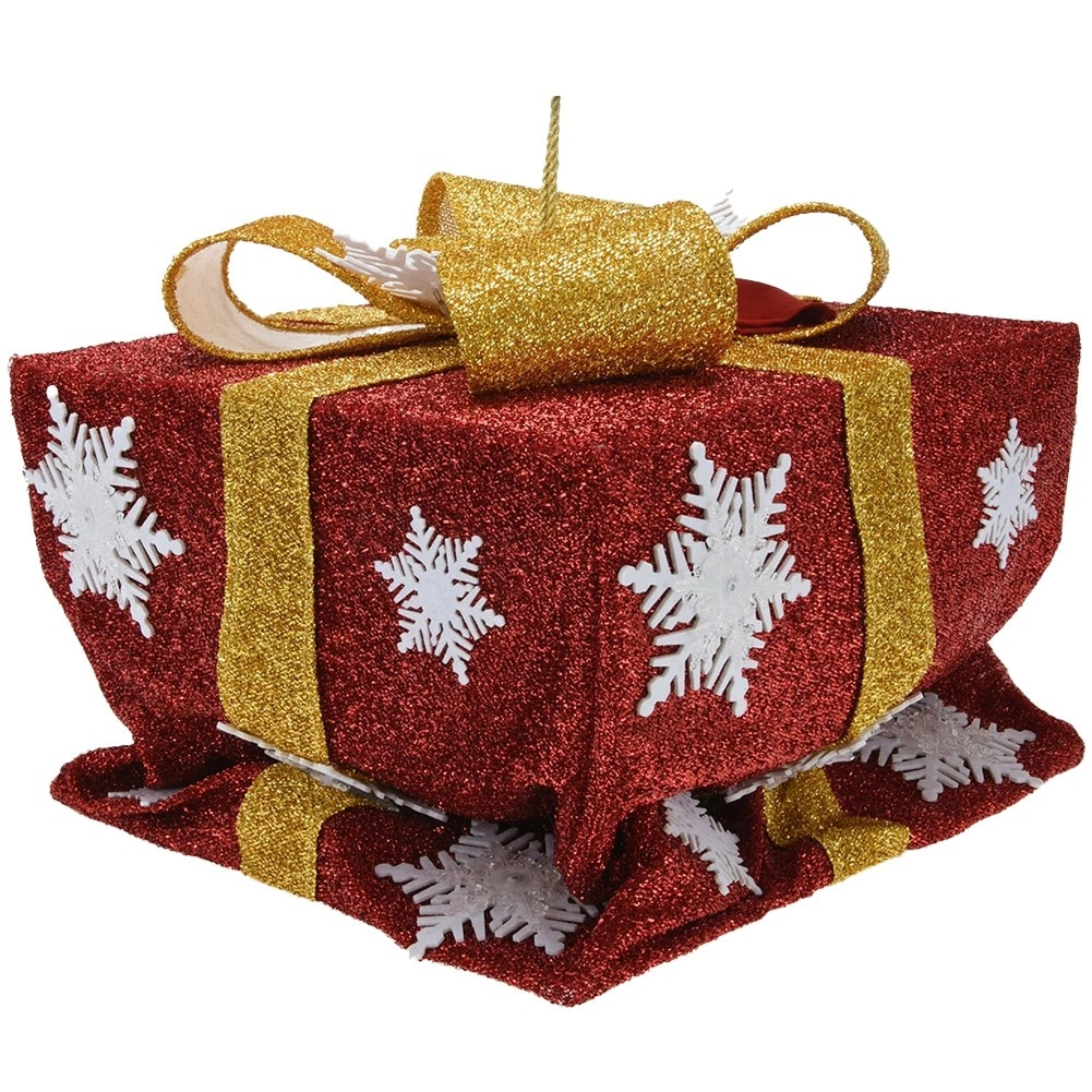 Rood glitteroppervlak, witte sneeuwvlokdecor en een gouden strik zorgen voor een luxueuze uitstraling die meteen opvalt.