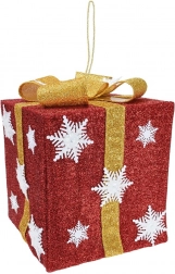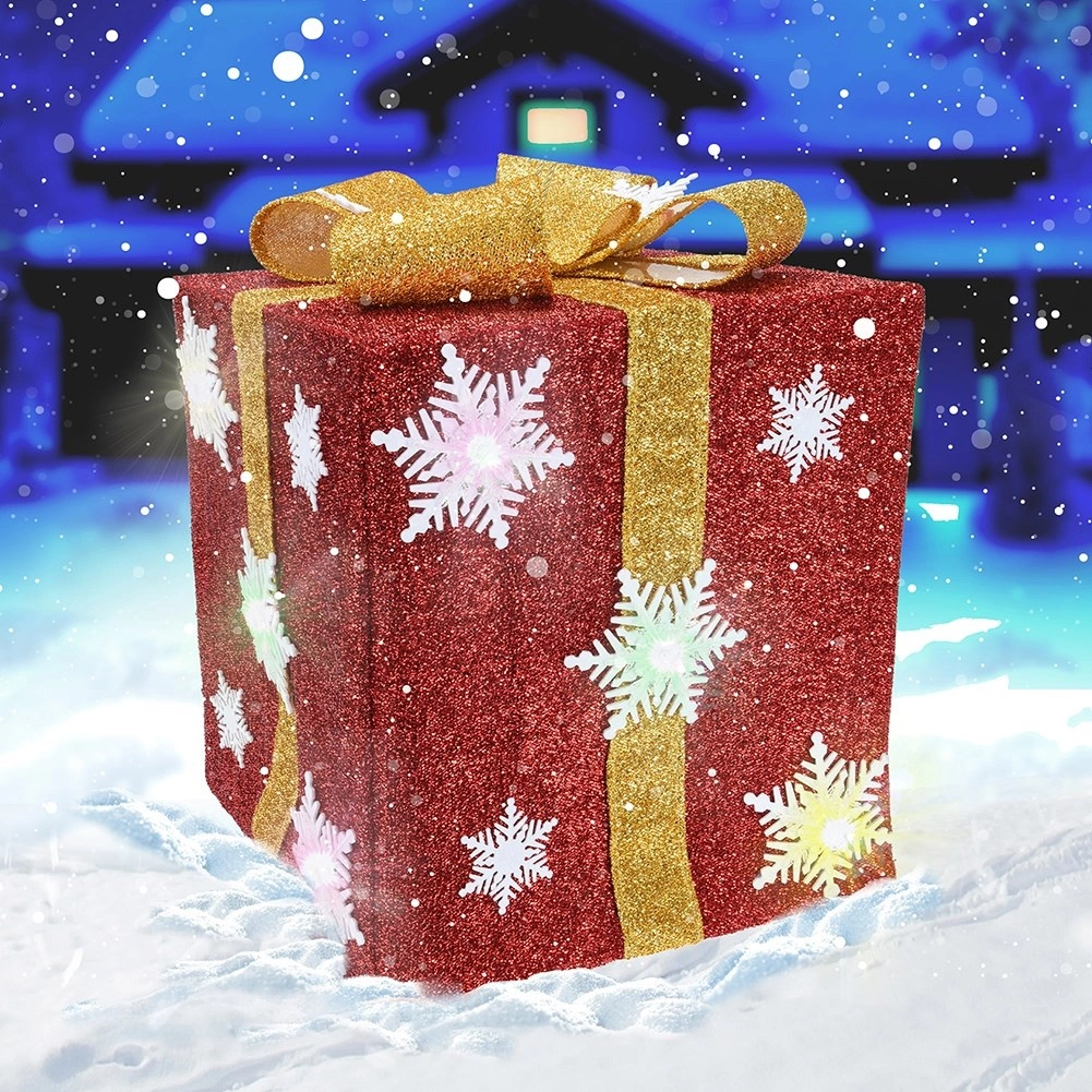 Creëer thuis en in de tuin de perfecte feestelijke sfeer met een lichtgevend cadeau in dieprood, versierd met witte sneeuwvlokken en een gouden strik. Geïntegreerde LED-diodes (14 st.) met kleurovergang laten de decoratie stralen met zacht, aantrekkelijk licht. Dankzij de opvouwbare constructie van metaal met decoratief oppervlak is de decoratie robuust en tegelijk eenvoudig op te bergen.