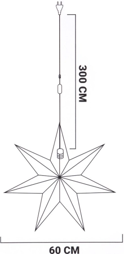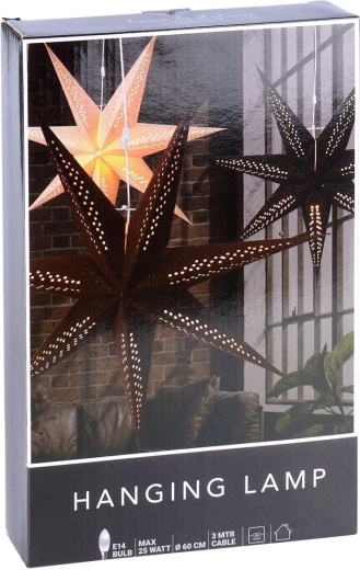 Elegante hangende ster met een diameter van 60 cm, gemaakt van stevig papier met een zachte fluwelen afwerking in bruin en gouden glinsterende details. Wanneer hij brandt, creëert hij een zacht, sfeervol licht en geeft hij je interieur zowel een feestelijke als jaarronde uitstraling. Werkt op netstroom, heeft een schakelaar, een kabel van 3 m en is geschikt voor een E14-lamp (max. 25 W, niet inbegrepen). Ideaal voor in het raam, aan de muur of overal waar je een gezellige sfeer wilt benadrukken.