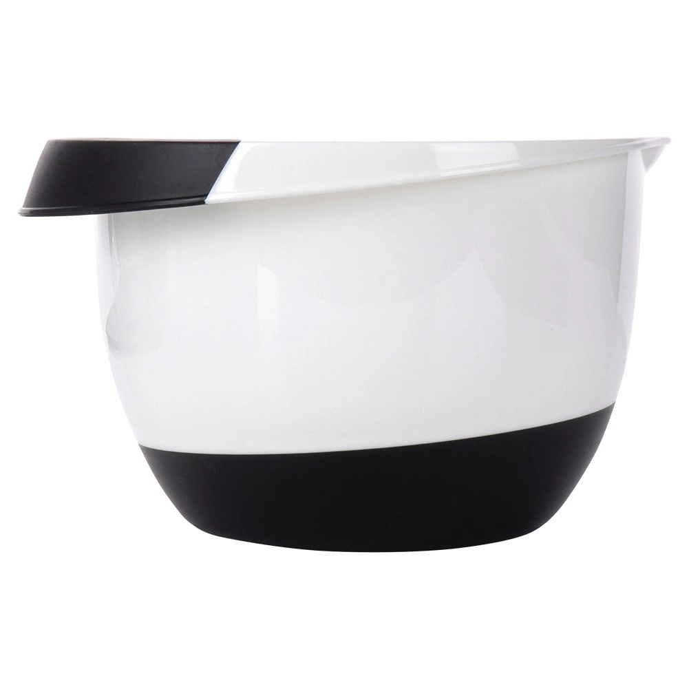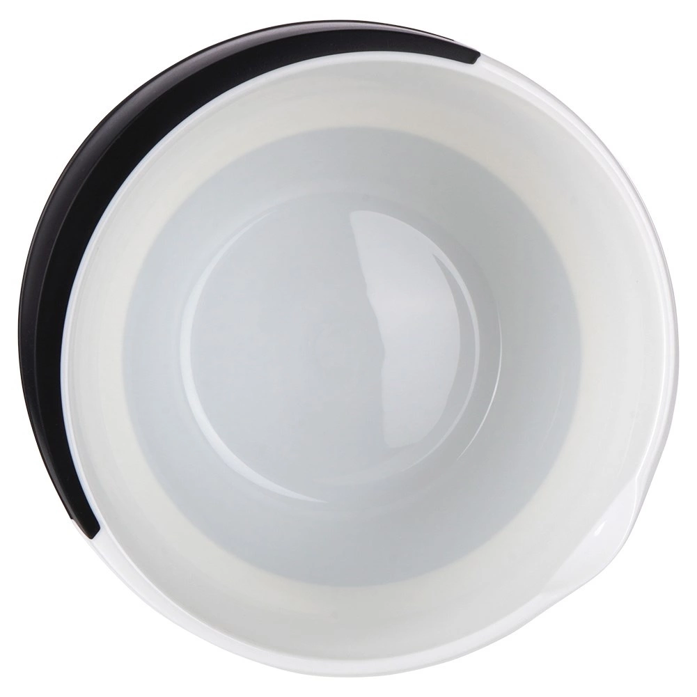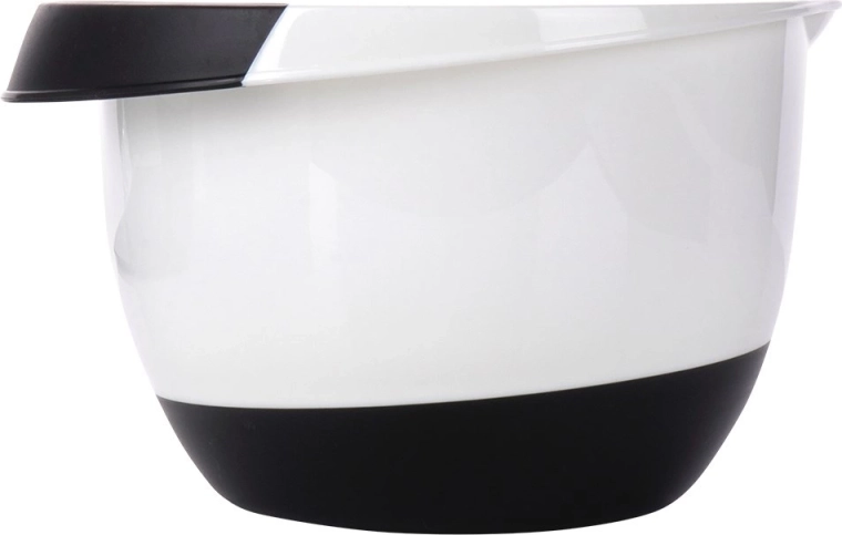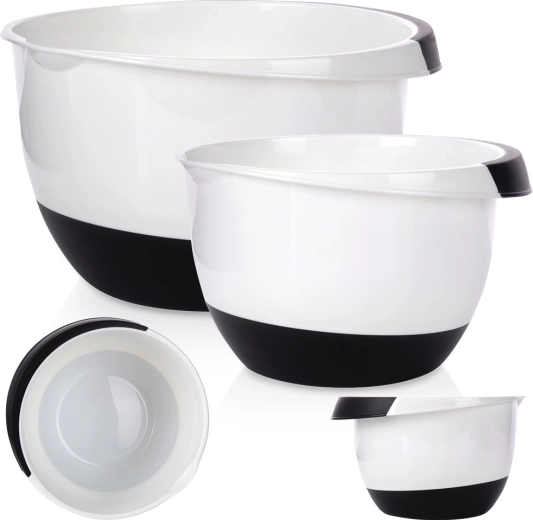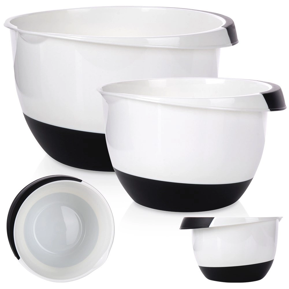 Universele set keukenkommen in het wit met zwarte, antislip bodems voor maximale stabiliteit op het aanrecht. Dankzij de geïntegreerde handgrepen en schenktuit is het gieten van deeg of sauzen schoon en nauwkeurig. De kommen zijn makkelijk te onderhouden, zeer licht en tegelijk duurzaam, ideaal voor dagelijks koken en bakken.