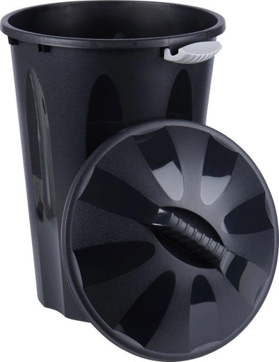 Praktische zwarte afvalbak met een inhoud van 50 l, voorzien van een goed afsluitend deksel en comfortabele handgrepen, houdt orde en geurtjes onder controle. Gemaakt van duurzaam plastic met 90% gerecycled materiaal, licht, stabiel en 100% recyclebaar.