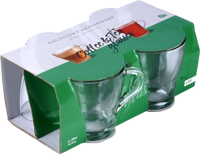 Praktische set van vier glazen mokken met oor, inhoud 280 ml, voor dagelijks drinken van koffie, thee en koude dranken. Gemaakt van hoogwaardig, dik glas dat transparant is, temperatuurbestendig, vaatwasmachinebestendig en geschikt voor de magnetron. Universele vorm en comfortabel oor voor een veilige grip bij warme dranken.
