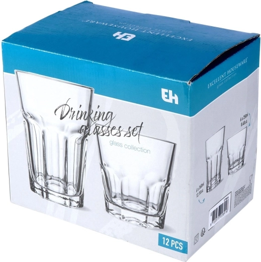 Praktische set van twaalf glazen in twee formaten voor elke dag. Bevat 6 kleinere glazen van 230 ml en 6 grotere van 330 ml van helder, duurzaam glas met een stijlvol facetpatroon. Ze zijn universeel voor water, sappen, limonades en drankjes, stabiel dankzij de dikke bodem en vaatwasmachinebestendig voor eenvoudig onderhoud.