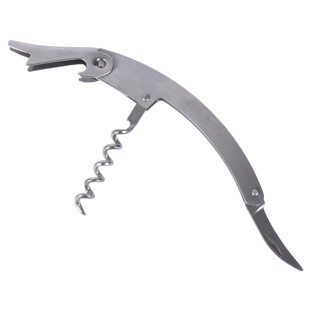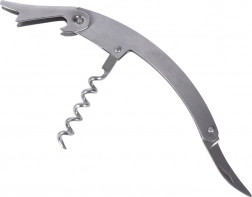 Inklapbare kelnerskurkentrekker met spiraal, hefboom en foliemesje voor snel en veilig openen van flessen en verwijderen van kroonkurken.
