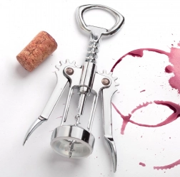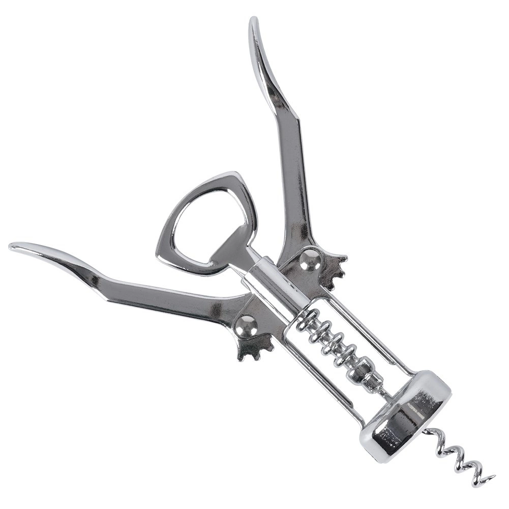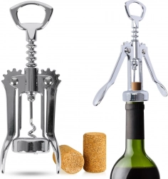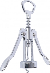 Praktische vleugelkurkentrekker van hoogwaardig roestvrij staal die het openen van wijn vereenvoudigt dankzij de spiraalboor en hefarmen. Draai in, druk de armen naar beneden en de kurk is eruit – snel, comfortabel en veilig. Het bovenste deel dient tevens als flesopener voor kroonkurken.