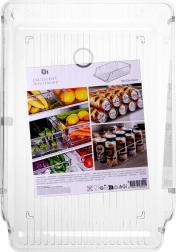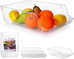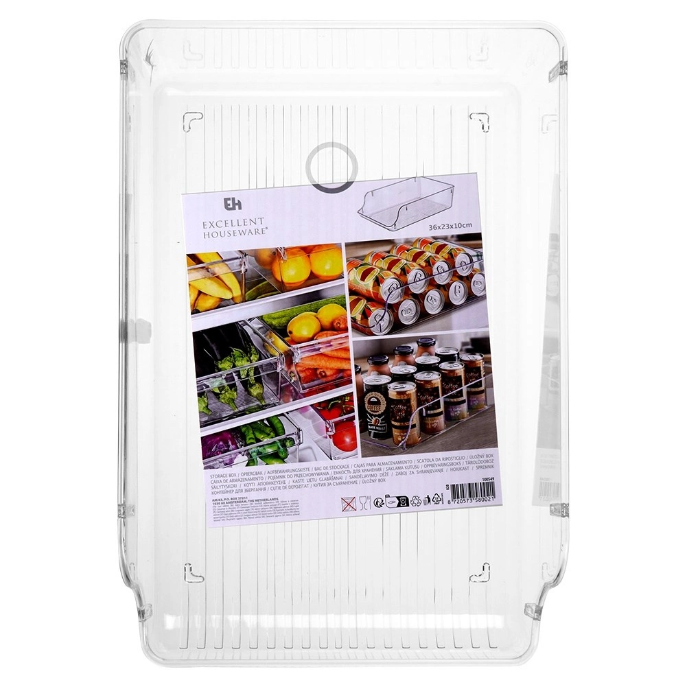 Praktische koelkastorganizer met afmetingen 35 × 22,5 × 10 cm om etenswaren overzichtelijk geordend te houden. Dankzij de transparante wanden heb je de inhoud altijd in het zicht en door de voorste uitsparing trek je hem gemakkelijk eruit. De box is van duurzame en voedselveilige kunststof, geschikt voor fruit, groenten en kleine etenswaren en past ook perfect in de voorraadkast of op een plank.