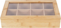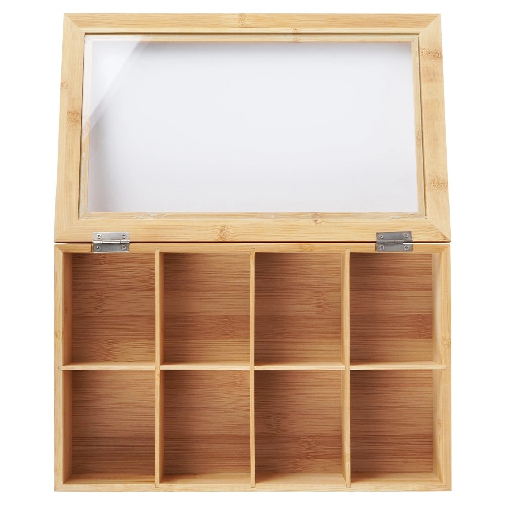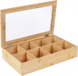Deze stijlvolle bamboe theekist biedt een slimme en esthetische oplossing voor het opbergen van theezakjes. Dankzij de acht gescheiden vakken sorteer je eenvoudig verschillende soorten en smaken thee. Het transparante deksel geeft snel inzicht in de inhoud zonder de doos te hoeven openen.