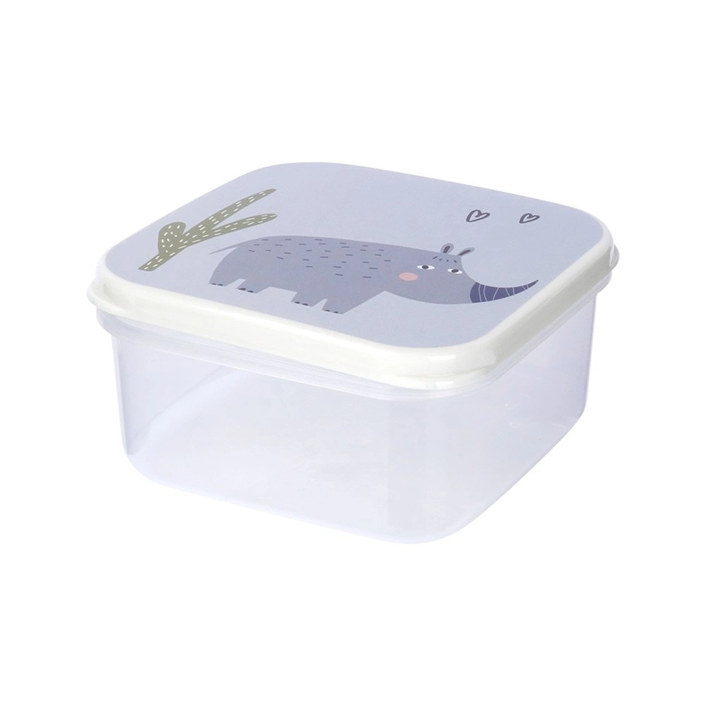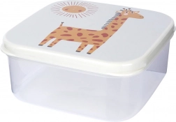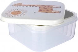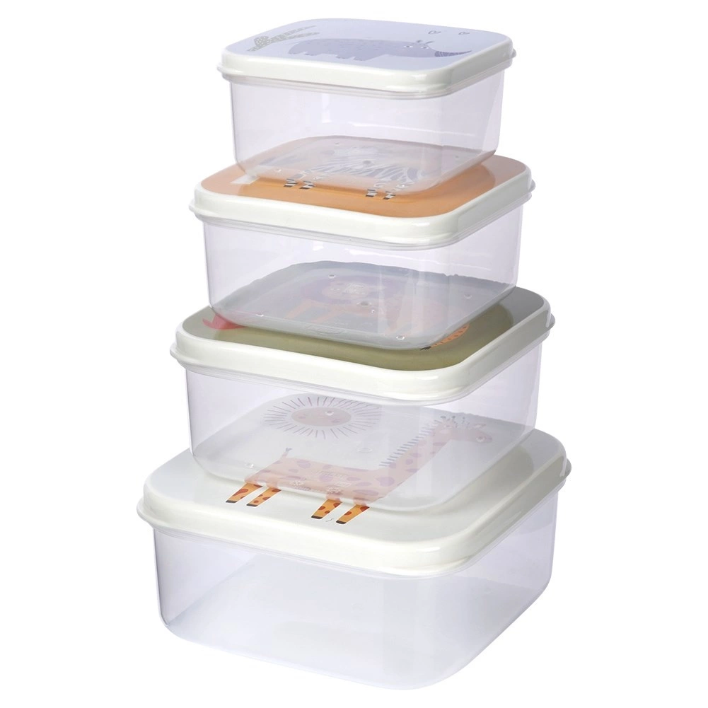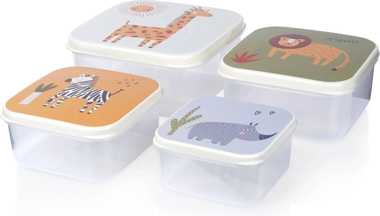 De set bevat vier transparante kunststof bakjes met witte deksels, elk met een ander vrolijk dierenmotief dat kinderen stimuleert om zelfstandig te eten. De verschillende maten zorgen voor perfecte organisatie van snacks, lunches en kleine traktaties. De bakjes zijn veilig voor de gezondheid en bevatten geen BPA.