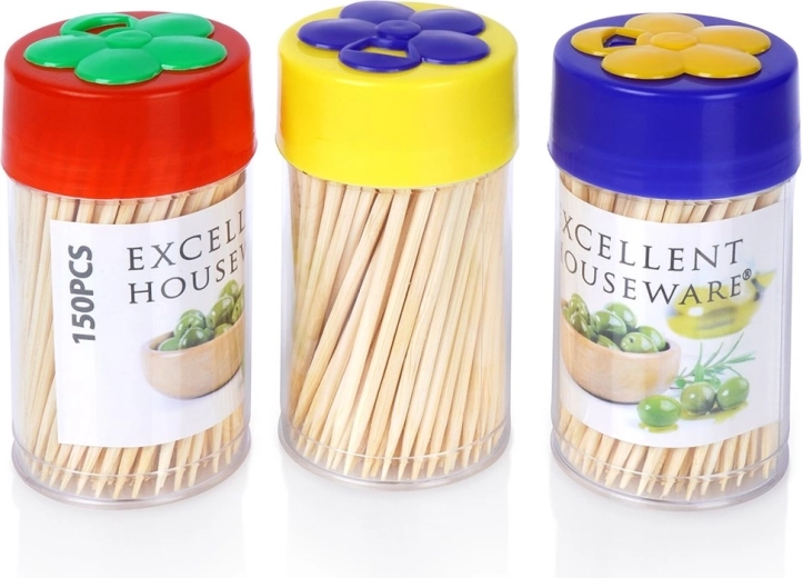 De set bevat 3 transparante dispensers, elk met 150 stuks hoogwaardige bamboe tandenstokers. Het natuurlijke materiaal is stevig, glad en veilig voor contact met voedsel. Dankzij het doseerdeksel is het gebruik snel, schoon en overzichtelijk.