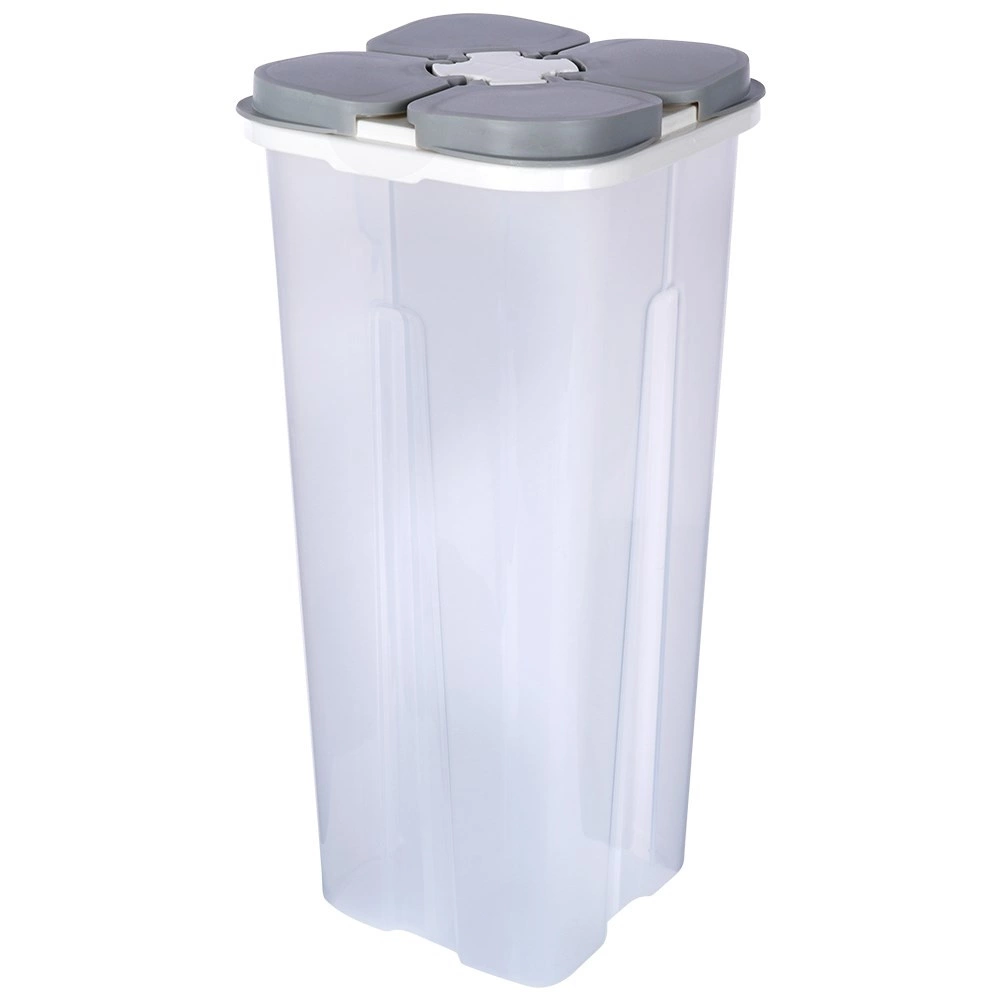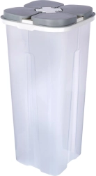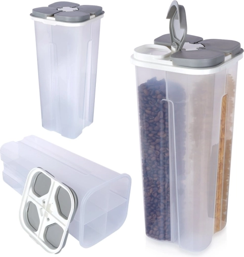 Praktische voorraadbus voor droge levensmiddelen met een inhoud van 3 liter, voorzien van vier afzonderlijke vakken en onafhankelijke uitgietdeksels. Dankzij het transparante lichaam heb je altijd zicht op de inhoud, de gevormde vorm vergemakkelijkt het hanteren en het sluitende deksel beschermt tegen vocht. Ideaal voor meel, suiker, rijst, pasta, ontbijtgranen en andere droge ingrediënten.