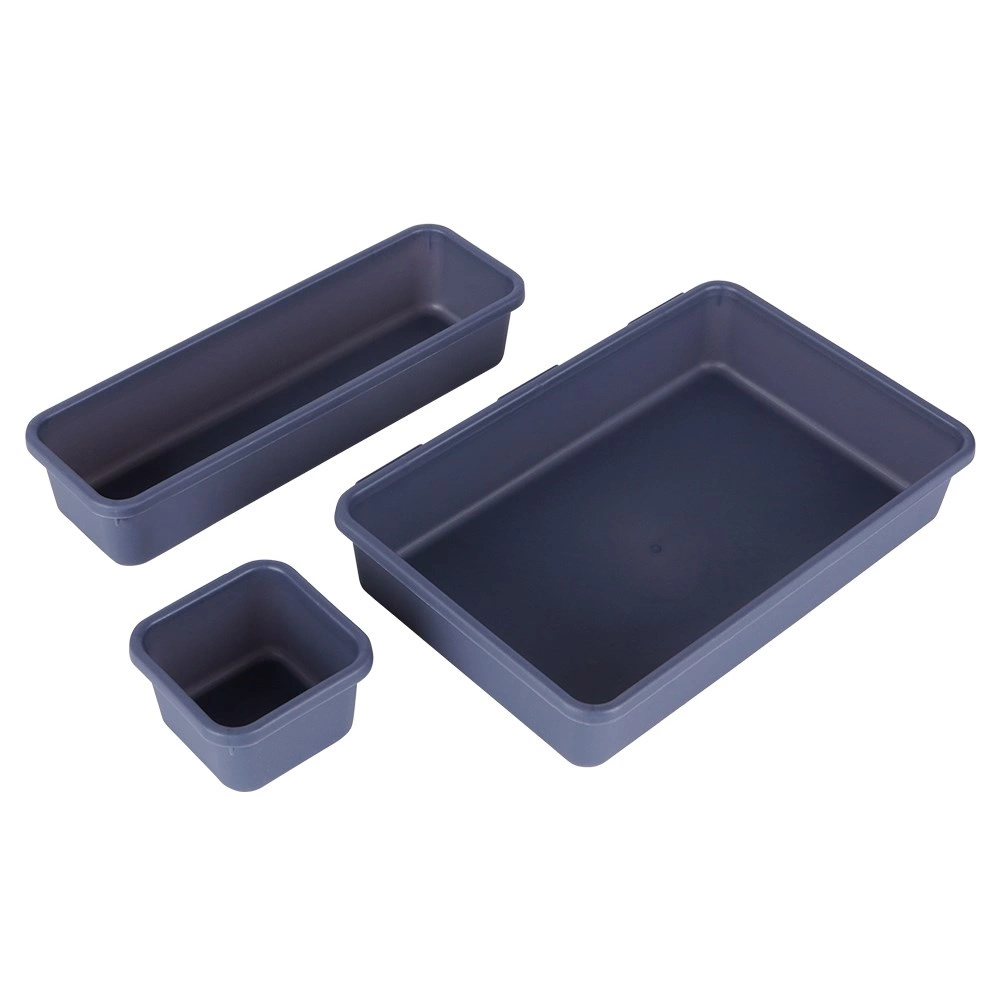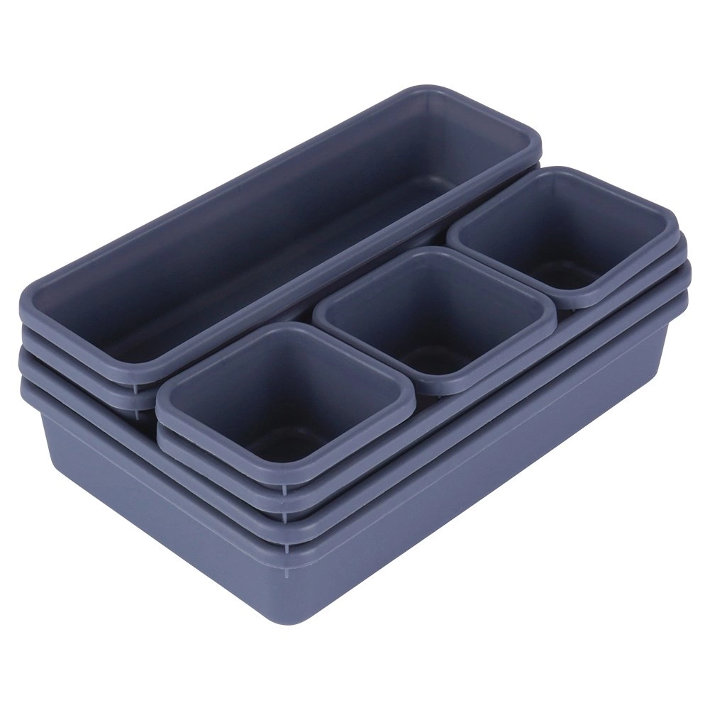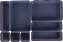 Houd orde in elke lade met de set van 8 modulaire organizers in grafietkleur. Combineer bakjes van verschillende formaten, creëer elke gewenste indeling en heb alles altijd binnen handbereik. Licht en duurzaam plastic, 3 praktische formaten, eenvoudig te reinigen en ruimtebesparend in elkaar te schuiven maken deze set ideaal voor kantoor, badkamer en kledingkast.
