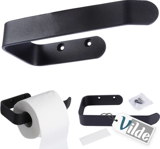 Stijlvolle en duurzame toiletpapierhouder in matzwart. Biedt een modern, minimalistisch ontwerp, eenvoudige vervanging van rollen en twee montagemethoden – lijmen zonder boren of klassiek met schroeven. Compacte afmetingen voor comfortabel dagelijks gebruik.