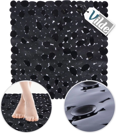 Praktische badkamermat van 51 × 51 cm voor een veilige en stabiele stap in douche, bad en douchebak. Dankzij het dichte netwerk van zuignappen blijft hij stevig vastzitten op een glad oppervlak, vermindert hij uitglijden op natte vloeren en is hij bovendien bestand tegen water en vocht. De elegante zwarte uitvoering past in elke badkamer.
