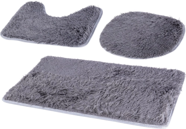 Stijlvolle set van drie badkamermatten in elegant grijs voor dagelijkse veiligheid en comfort. Bevat een rechthoekige mat, een U-vormige wc-mat en een hoes voor de wc-bril. De zachte, dichte pool is aangenaam om aan te raken, de anti-slip onderzijde zorgt voor stabiliteit en het universele design past in zowel moderne als klassieke interieurs.