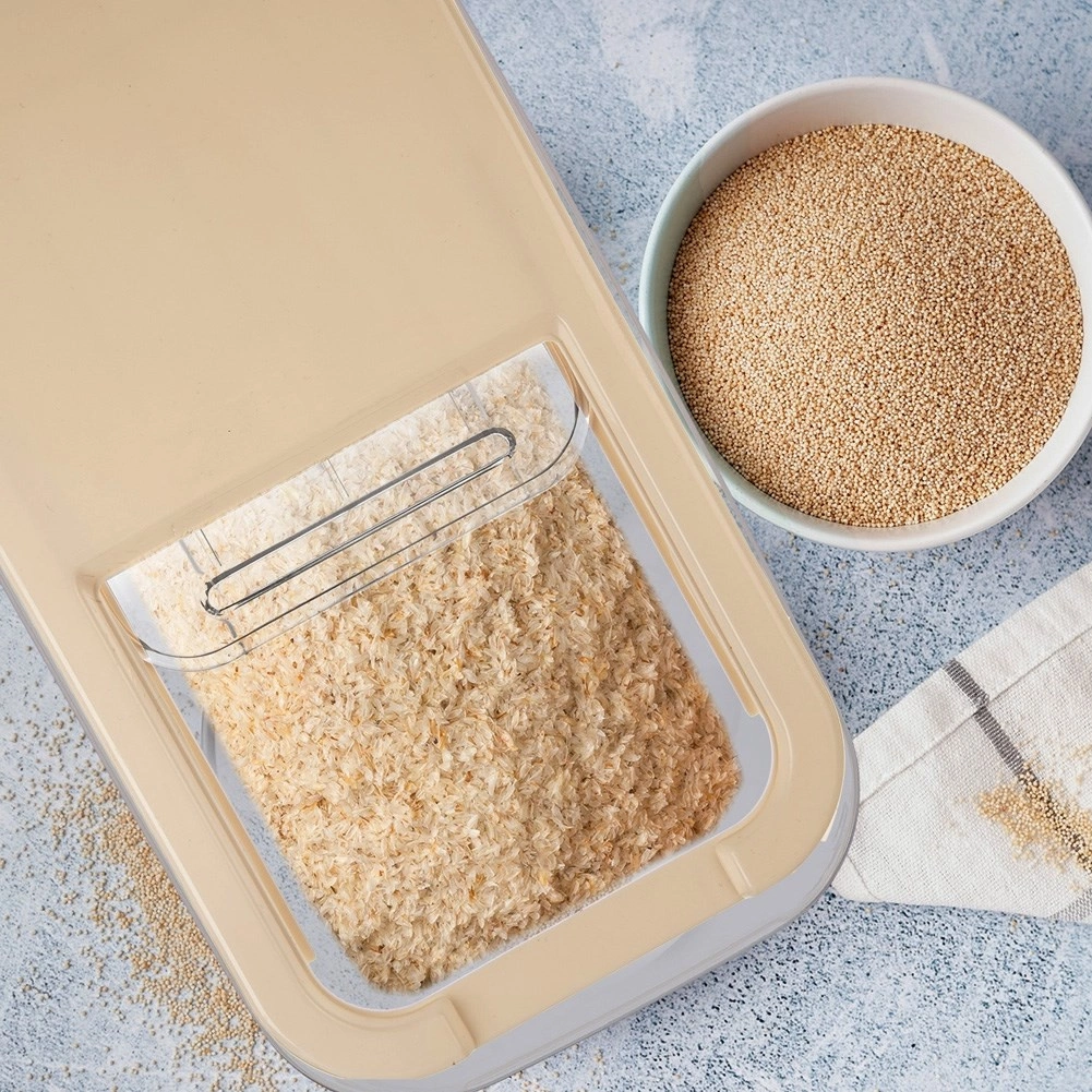 Het geïntegreerde schuifraampje in het deksel maakt doseren mogelijk zonder de hele container te openen – ideaal voor dagelijks gebruik in keuken en voorraadkast.