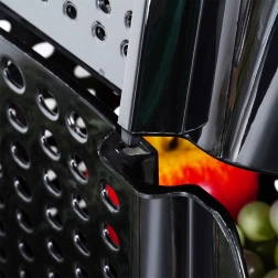 De geperforeerde wanden zorgen voor luchtcirculatie, waardoor fruit en groenten langer vers blijven en goed zichtbaar zijn.