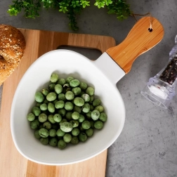 Ontdek een elegante manier van serveren met de porseleinen schaal met bamboe handgreep uit de TERRESTRIAL-collectie van NAVA. Dankzij de comfortabele greep is dragen en serveren veilig en prettig, terwijl de combinatie van wit porselein en natuurlijk bamboe de tafel een moderne en tijdloze look geeft.