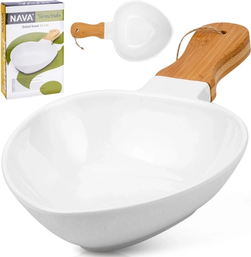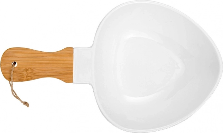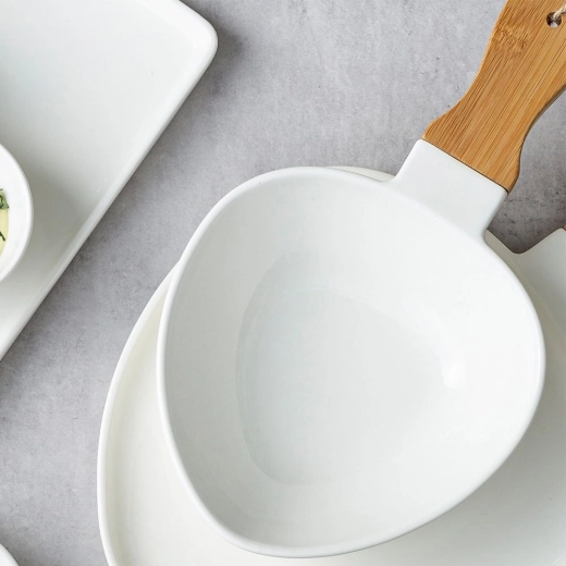 Stijlvolle porseleinen schaal met bamboe handgreep voor het fraai serveren van gerechten. Biedt een elegante uitstraling, praktische grip, universele toepassing en duurzame uitvoering voor thuis en in de horeca.