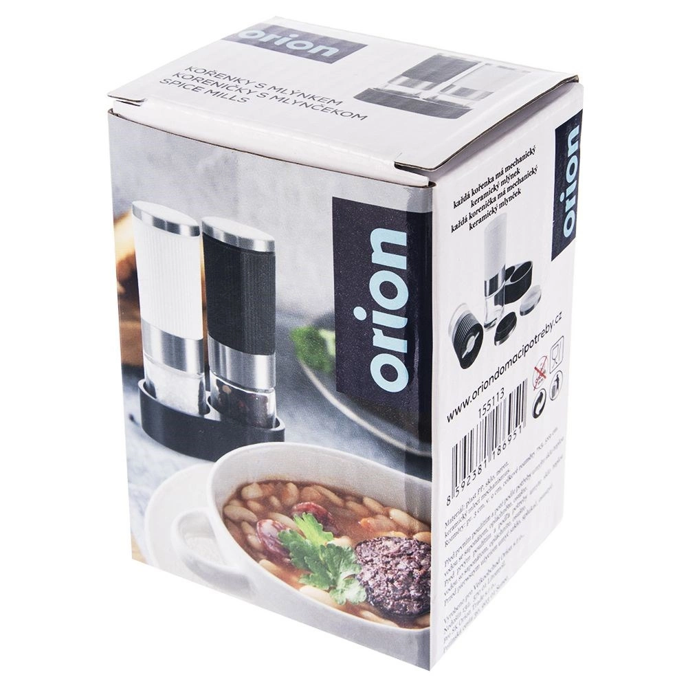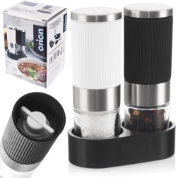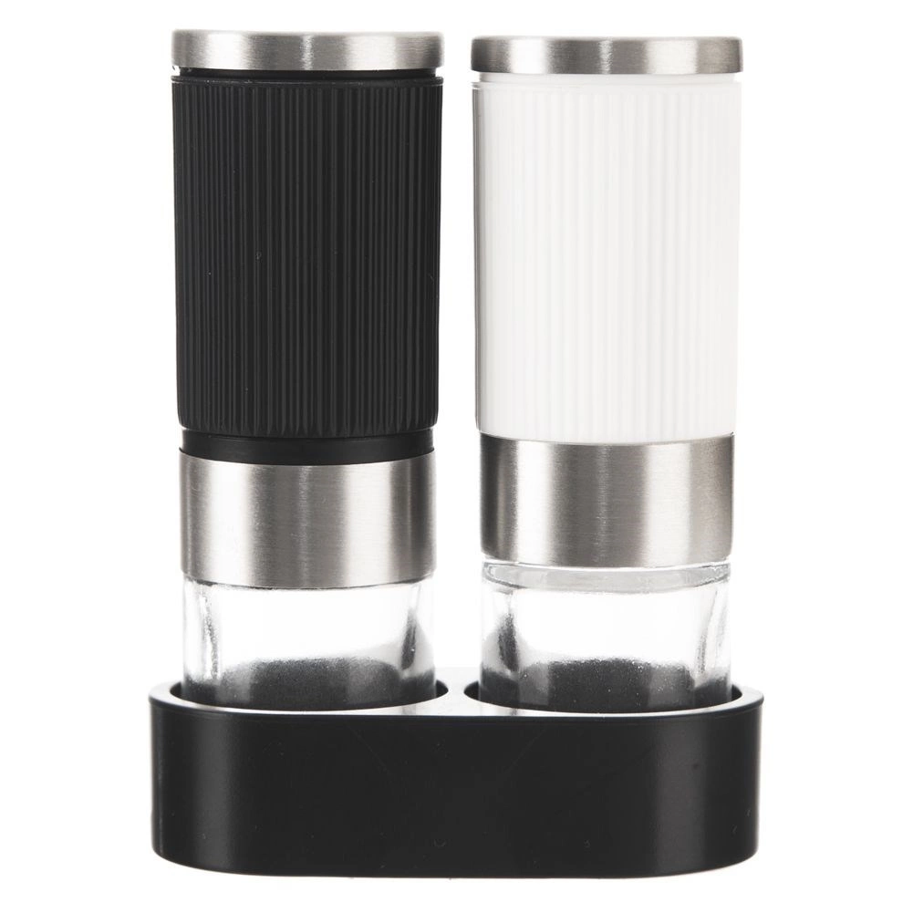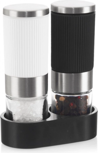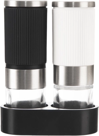 Stijlvolle set van twee handmatige zout- en pepermolens met stabiele houder, perfect voor zowel moderne als klassieke keukens. Transparant glas maakt voorraadcontrole eenvoudig, roestvrijstalen details geven een premium uitstraling en het geribbelde lichaam in zwart en wit zorgt voor een zekere grip, zelfs met natte handen.