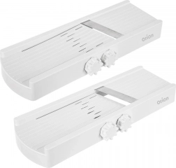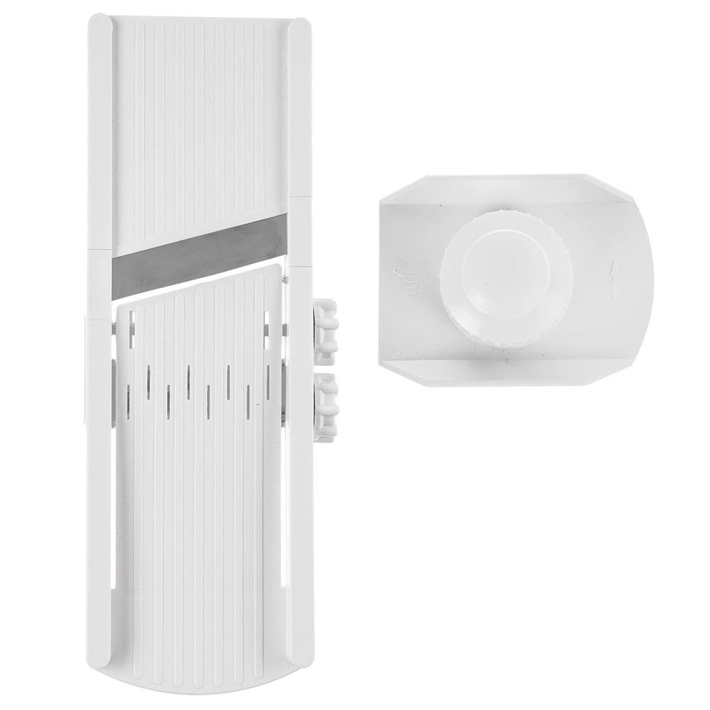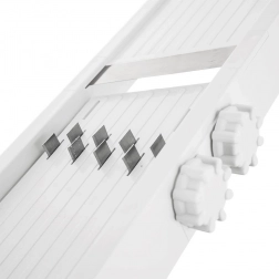 Deze duurzame mandoline in het wit combineert snelheid, precisie en veiligheid bij het snijden van fruit en groente. De traploze dikteverstelling via de zijdelingse knop maakt snijden mogelijk van extra dunne plakjes tot dikkere plakken tot 8 mm – ideaal voor komkommers in salades, plakken voor op de grill, knapperige chips en zelfgemaakte frietjes.