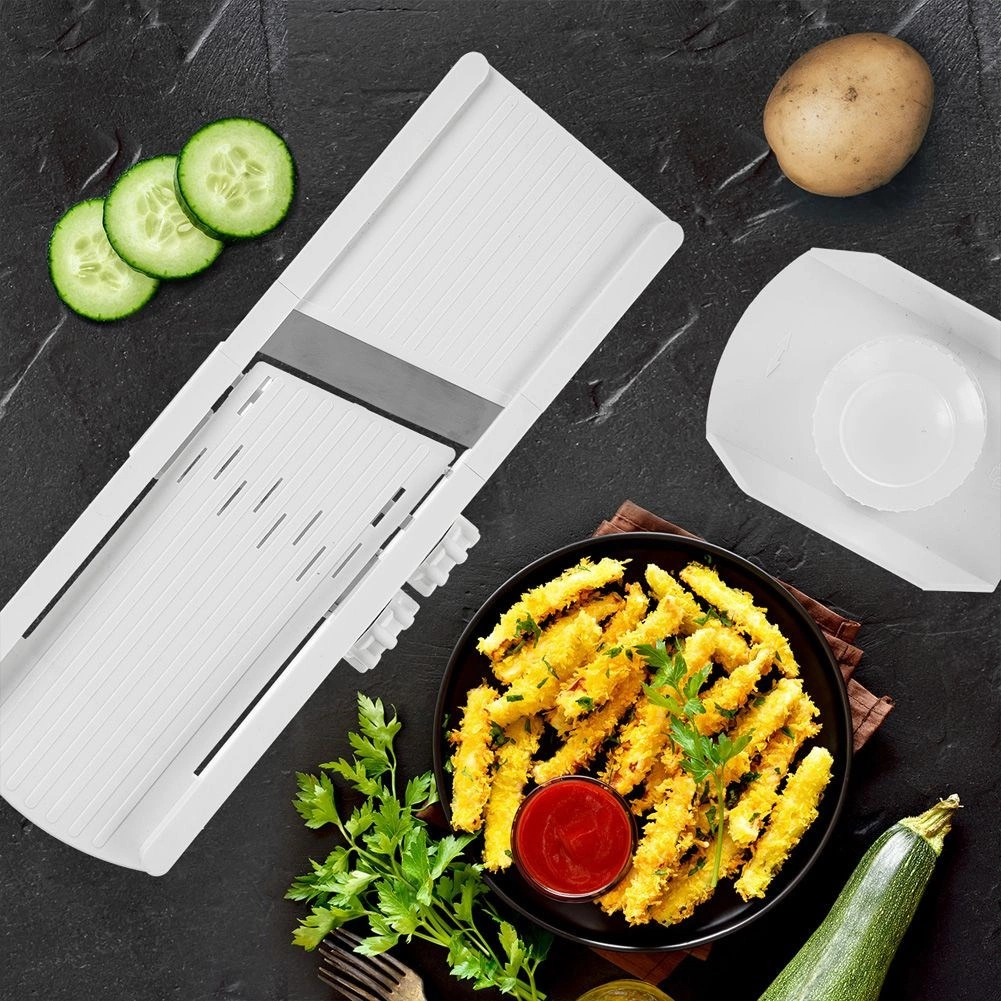 Stel eenvoudig de plakdikte in van flinterdun tot wat dikker – perfect voor komkommer, courgette, aardappelen en andere ingrediënten.