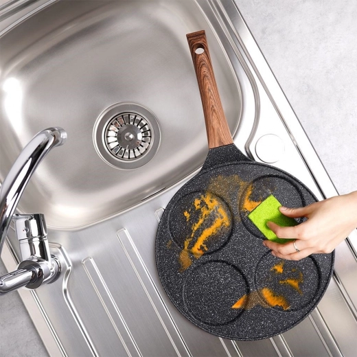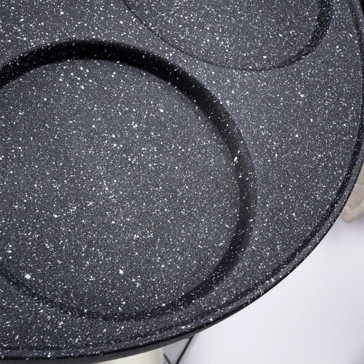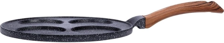 Praktische granieten pan voor eieren en pannenkoekjes met vier vormen met een diameter van 9,5 cm voor een perfect ronde vorm. Dankzij het antiaanbakoppervlak bereid je gezonde en gelijkmatig gegaarde ontbijtjes met een minimum aan olie. De ergonomische handgreep met houtlook ligt prettig in de hand en de pan is geschikt voor alle soorten kookplaten, inclusief inductie.