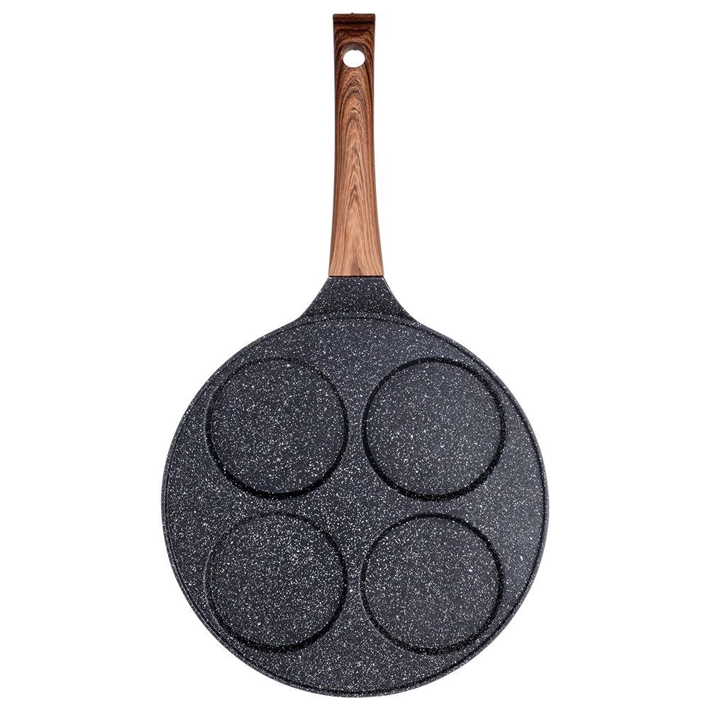 Stijlvolle pan uit de BLACK&WOOD-lijn in de populaire combinatie van zwarte steenlook en hout, maakt het bereiden van eieren, poffertjes en mini pancakes eenvoudig. Vier toegewezen uitsparingen helpen de ideale vorm en grootte te behouden, terwijl het aluminium lichaam met gelijkmatige warmteverdeling de kooktijd verkort en energie bespaart.