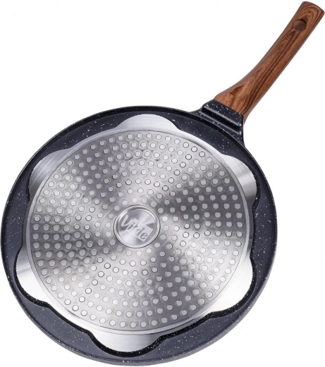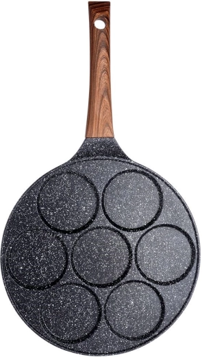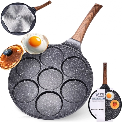 Universele pan voor eieren en pannenkoekjes met 7 ronde vormen met een diameter van 8 cm zorgt voor een perfecte vorm en gelijkmatige garing. Het duurzame aluminium lichaam met een antiaanbak granieten oppervlak maakt koken met een minimum aan vet mogelijk; de ergonomische handgreep met houtlook is comfortabel en veilig. Dankzij de gelijkmatige warmteverdeling bespaart hij tijd en energie en is hij geschikt voor gas, elektrisch, keramisch, halogeen en inductie.