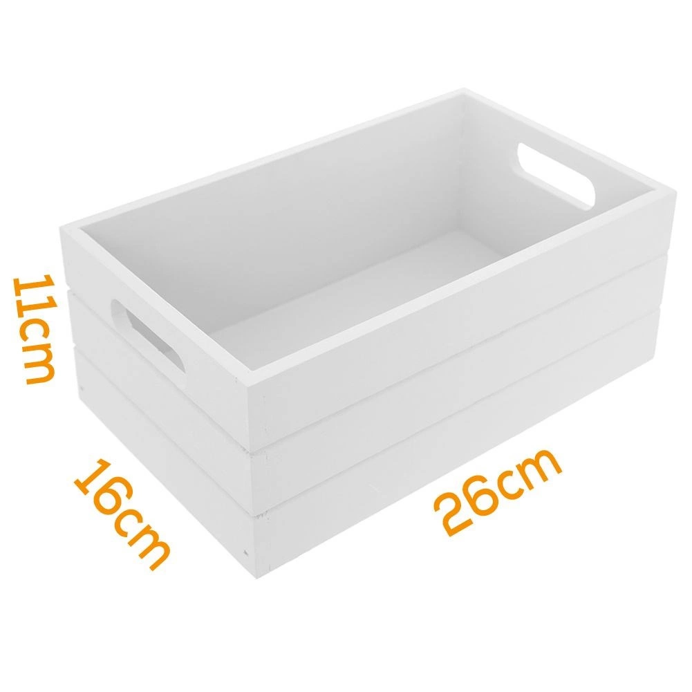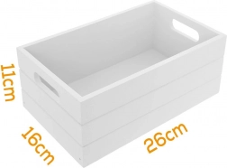 Deze witte houten krat is een ideale keuze voor stijlvolle en overzichtelijke opslag in huis en op kantoor. Dankzij de compacte afmetingen van 26 × 16 × 11 cm past hij op een plank, commode of bureau en de ovale handgrepen maken dragen comfortabel.