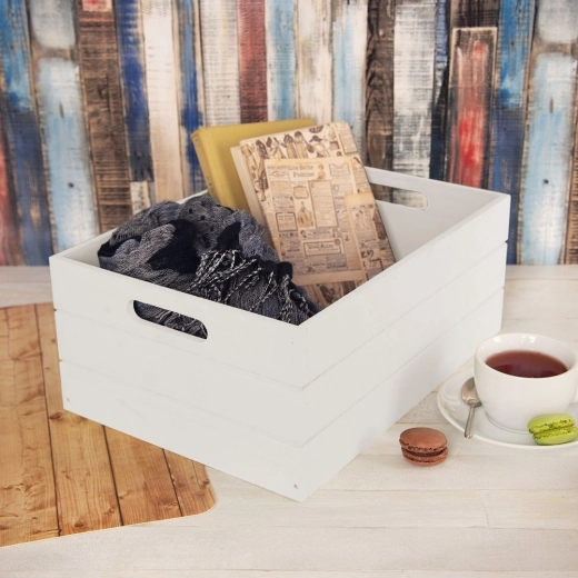 Universele houten kist in tijdloos wit helpt orde te houden in elke kamer. Gemaakt van duurzaam hout en dankzij de ovale uitsparingen aan de zijkanten gemakkelijk te dragen. Het minimalistische uiterlijk past in zowel moderne als klassieke interieurs.