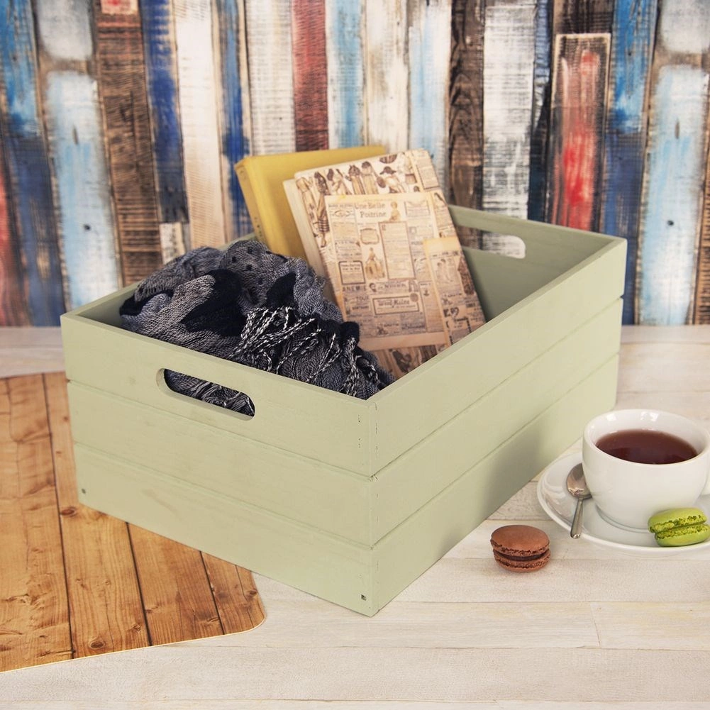 Stijlvolle houten krat voor overzichtelijke opslag thuis en op kantoor. Biedt stevige afwerking, praktische handgrepen aan de zijkant en universeel gebruik van cosmetica en kantoorbenodigdheden tot fruit, groenten of kruiden. In pastel lichtgroen past hij perfect in ieder interieur.