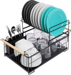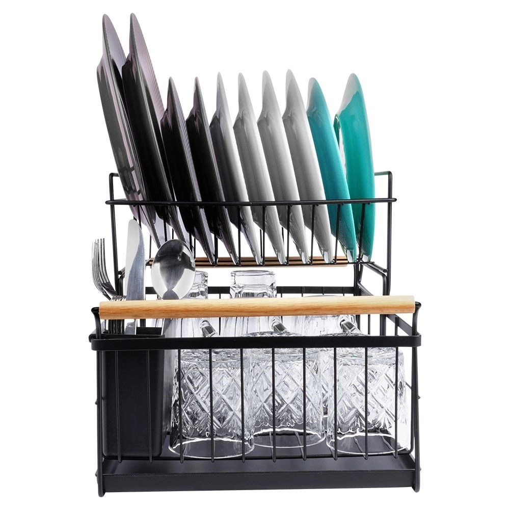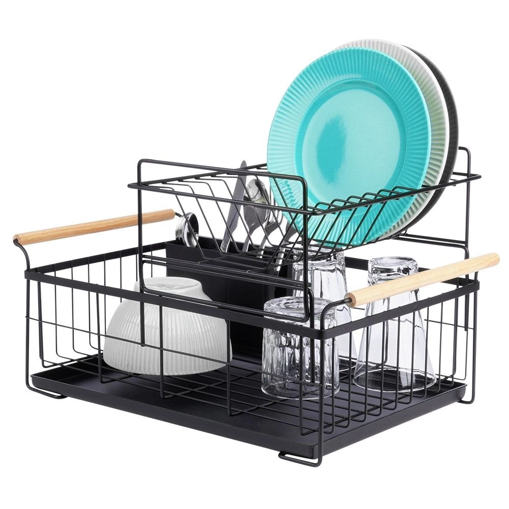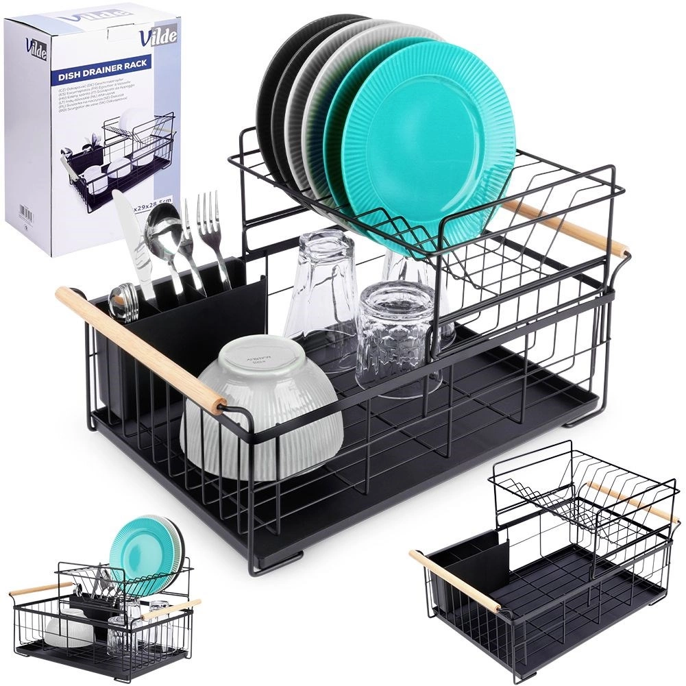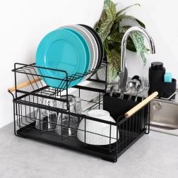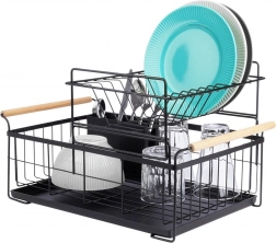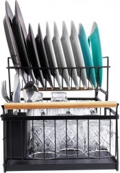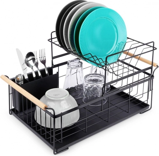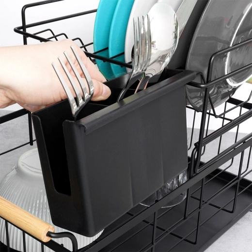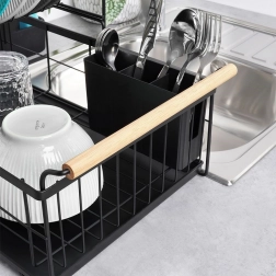 Robuust zwart metaal past perfect bij zowel moderne als klassieke keukens en de bamboe handgrepen bieden zowel stijl als comfort bij het verplaatsen. De bestekhouder met twee compartimenten kan binnen of buiten het frame worden geplaatst en is gemakkelijk te verwijderen voor reiniging.