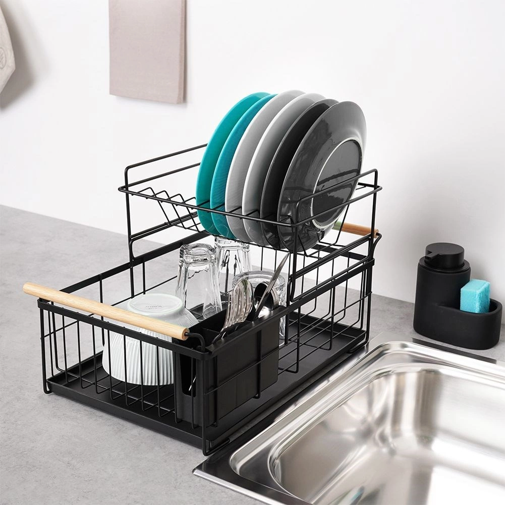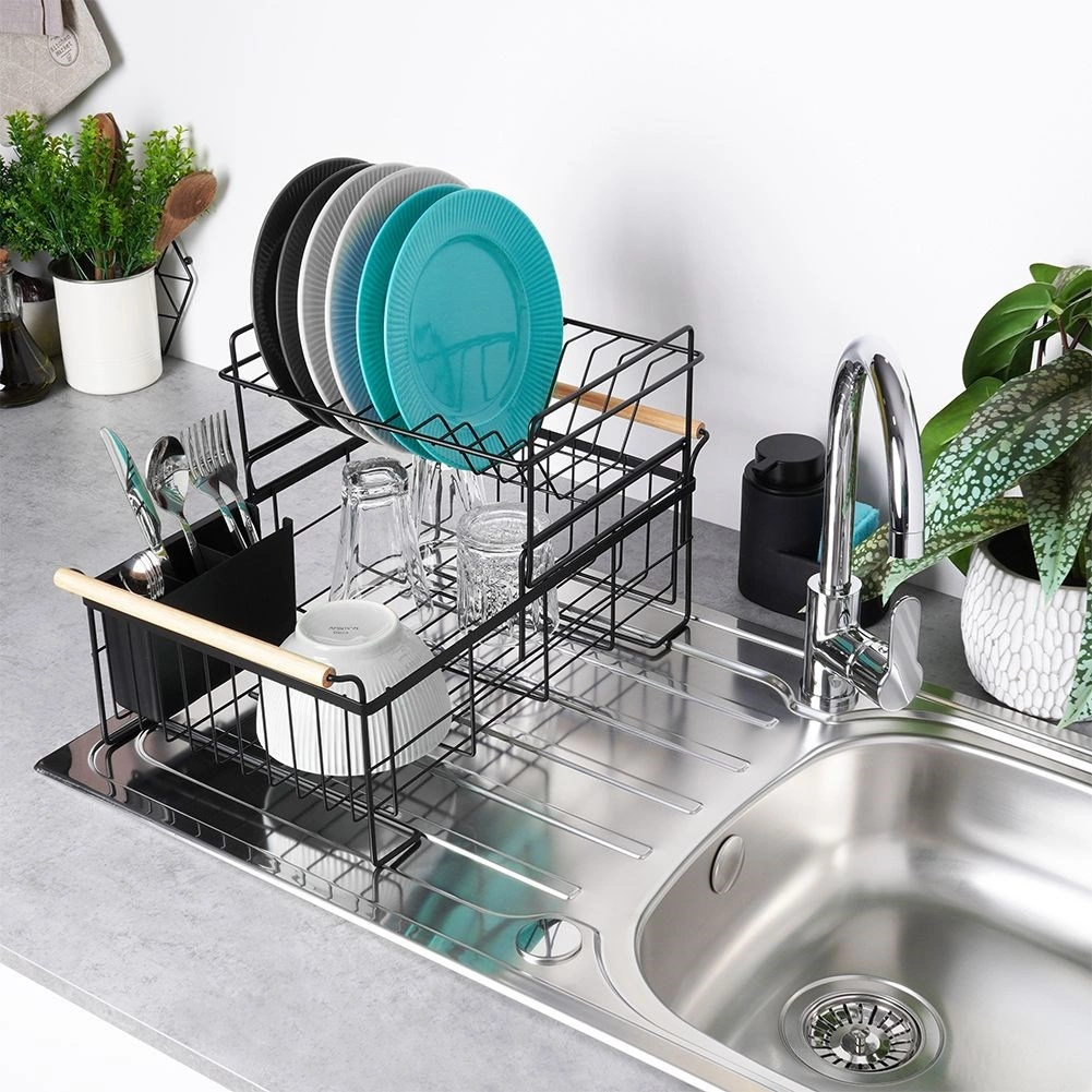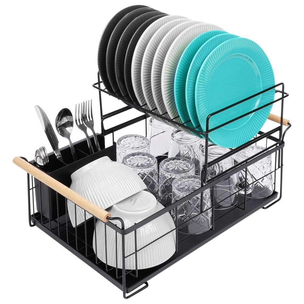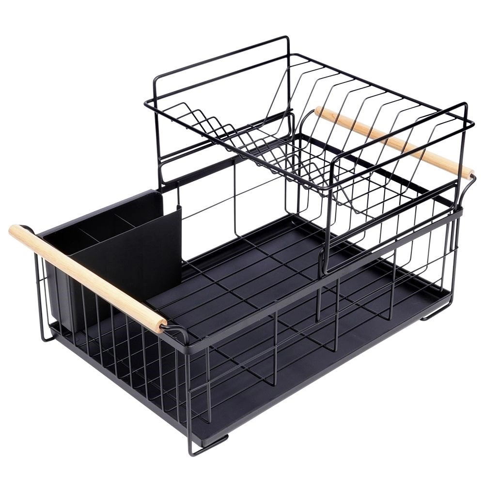 Robuust zwart metaal past perfect bij zowel moderne als klassieke keukens en de bamboe handgrepen bieden zowel stijl als comfort bij het verplaatsen. De bestekhouder met twee compartimenten kan binnen of buiten het frame worden geplaatst en is gemakkelijk te verwijderen voor reiniging.