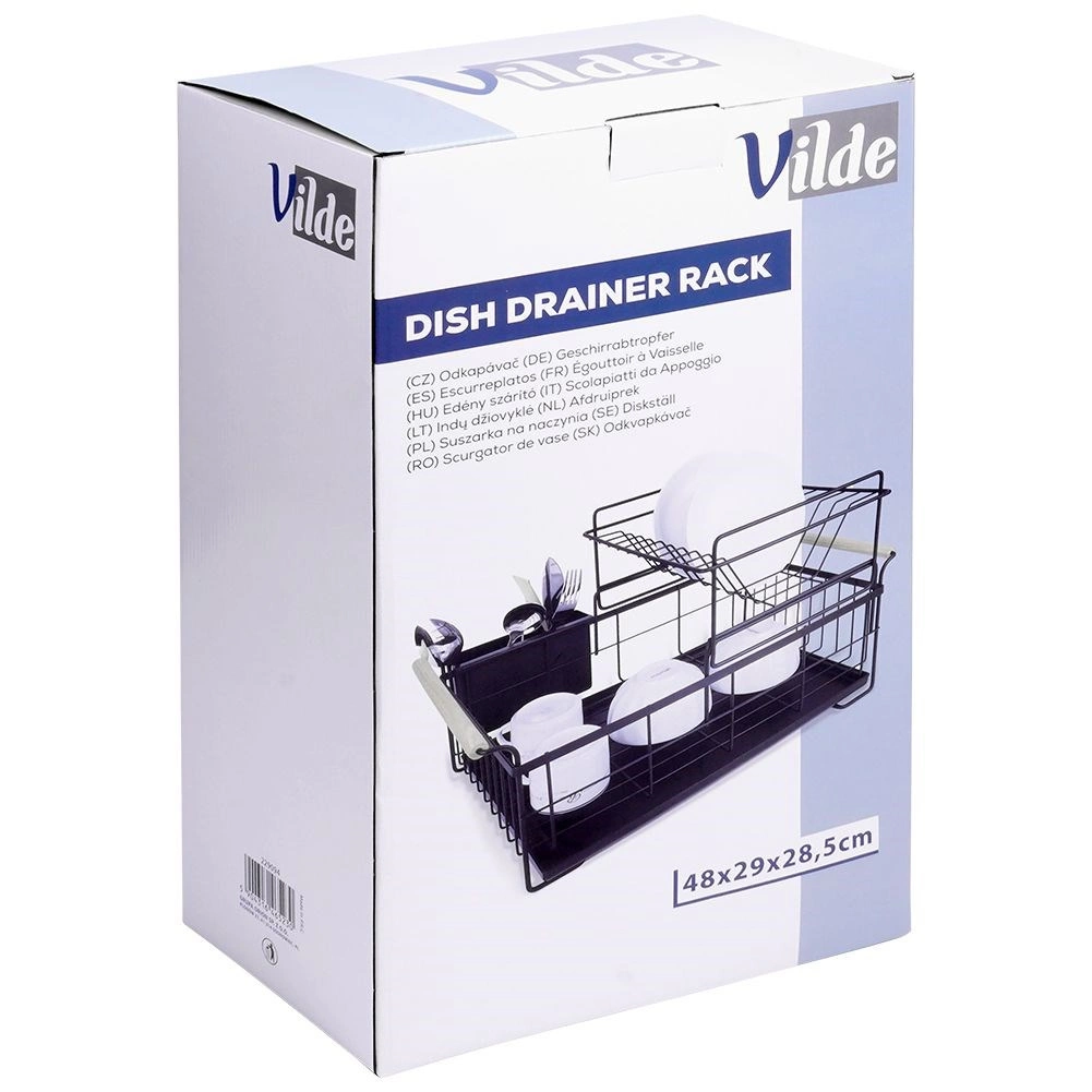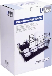 De lekbak vangt water op en is eenvoudig schoon te maken. De bestekhouder met twee compartimenten is afneembaar en kan binnen of buiten het rek worden geplaatst.