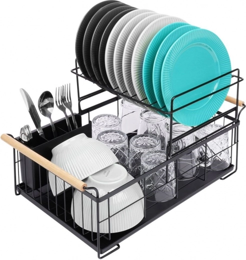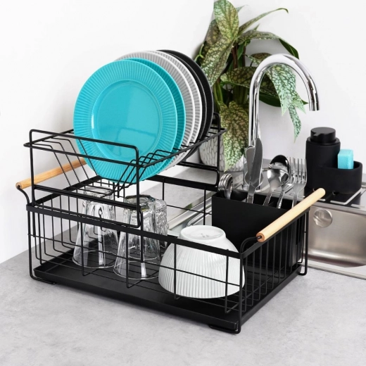Een elegant afdruiprek met twee lagen in het zwart bespaart ruimte en houdt het keukenblad droog en overzichtelijk. Het biedt een uitneembare lekbak, een bestekhouder met twee compartimenten en praktische bamboe handgrepen voor gemakkelijk verplaatsen. Gemaakt van duurzaam metaal, met ruimte voor borden, kommen, glazen en bestek, en past perfect in een industrieel interieur. De tweeledige constructie vergroot de capaciteit en versnelt het drogen van de vaat.
